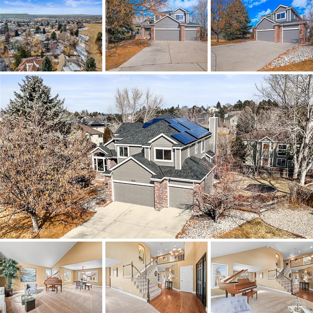 This home has it all! South facing, cul-de-sac, open space, owned solar panels, 6 bedrooms, 4 bathrooms, finished walkout basement, extended trex deck, stamped concrete back patio, newer windows, new roof, Rock Canyon High School! The main floor features a vaulted entry and formal living room, large formal dining room, family room with built-ins and gas fireplace, spacious kitchen and eating area that leads to the trex deck, office/bedroom with French doors, ensuite 3/4 bathroom, laundry room with cabinets that leads to a 3 car garage. Upstairs there are 5 bedrooms, the primary bedroom has double doors, bay windows, built-ins, 5-piece primary bathroom with jetted tub, walk-in closet, 4 additional bedrooms, a Jack-and-Jill 3/4 bathroom, and full bathroom with dual vanity, and a loft area. The finished basement has a built-in entertainment center, large great room, wet bar, storage room, and access to the spacious backyard. The .3 acre lot has raised bed gardens, flat grass area, patio, built-in trampoline. This home is located in the desirable Falcon Creek area on the east side of Highlands Ranch with convenient access to I-25 and C-470, Highland Heritage Park, Post Office, shopping, dining, Skyridge Hospital, and Park Meadows Mall. Enjoy the 4 Highlands Ranch Rec Centers featuring pools, fitness centers, classes, camps, tennis, and pickle ball courts, over 70 miles of trails, more than 20 parks. Walk the neighborhood and take in your stunning mountain views. Make this your new home!