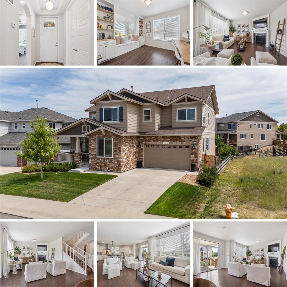 Beautiful DR Horton Home on a Corner Lot Backing to Open Space – Enjoy stunning Colorado sunsets from the spacious front patio of this meticulously maintained home, perfectly situated on a desirable corner lot with open space behind. The main level features a bright and open layout with thoughtful upgrades throughout. A dedicated home office with custom built-ins offers a quiet workspace, while a main-level bedroom and adjacent ¾ bathroom provide flexibility for guests or multigenerational living. The formal dining room, enhanced with elegant wainscoting, is ideal for hosting gatherings. At the heart of the home, the expansive great room with a cozy gas fireplace flows seamlessly into the casual dining area and chef’s kitchen—perfect for everyday living and entertaining. The kitchen impresses with crisp white cabinetry, gleaming quartz countertops, a large island, double ovens, gas cooktop...WOW! Upstairs, a spacious loft provides a versatile second living area or playroom. The generous primary suite includes a peaceful sitting area with fireplace and a luxurious 5-piece en-suite bath. Two additional bedrooms are connected by a convenient Jack-and-Jill bathroom. The full, unfinished basement offers endless potential for future expansion or storage. A tandem three-car garage with epoxy flooring provides ample space for vehicles, tools, and recreational gear. Step outside to a beautifully landscaped, fully fenced backyard featuring a covered deck and a patio with a pergola—ideal for morning coffee, evening relaxation, or summer entertaining. Additional features include an attic fan & dual A/C units for optimal comfort throughout the seasons. Located directly across from the sought-after Terrain Swim Club and Dog Bone Park, this peaceful community offers access to scenic trails, neighborhood parks, and top-rated amenities. Shopping, dining, and the local elementary school are just minutes away. Lovingly maintained, this move-in-ready home is ready for its next chapter!