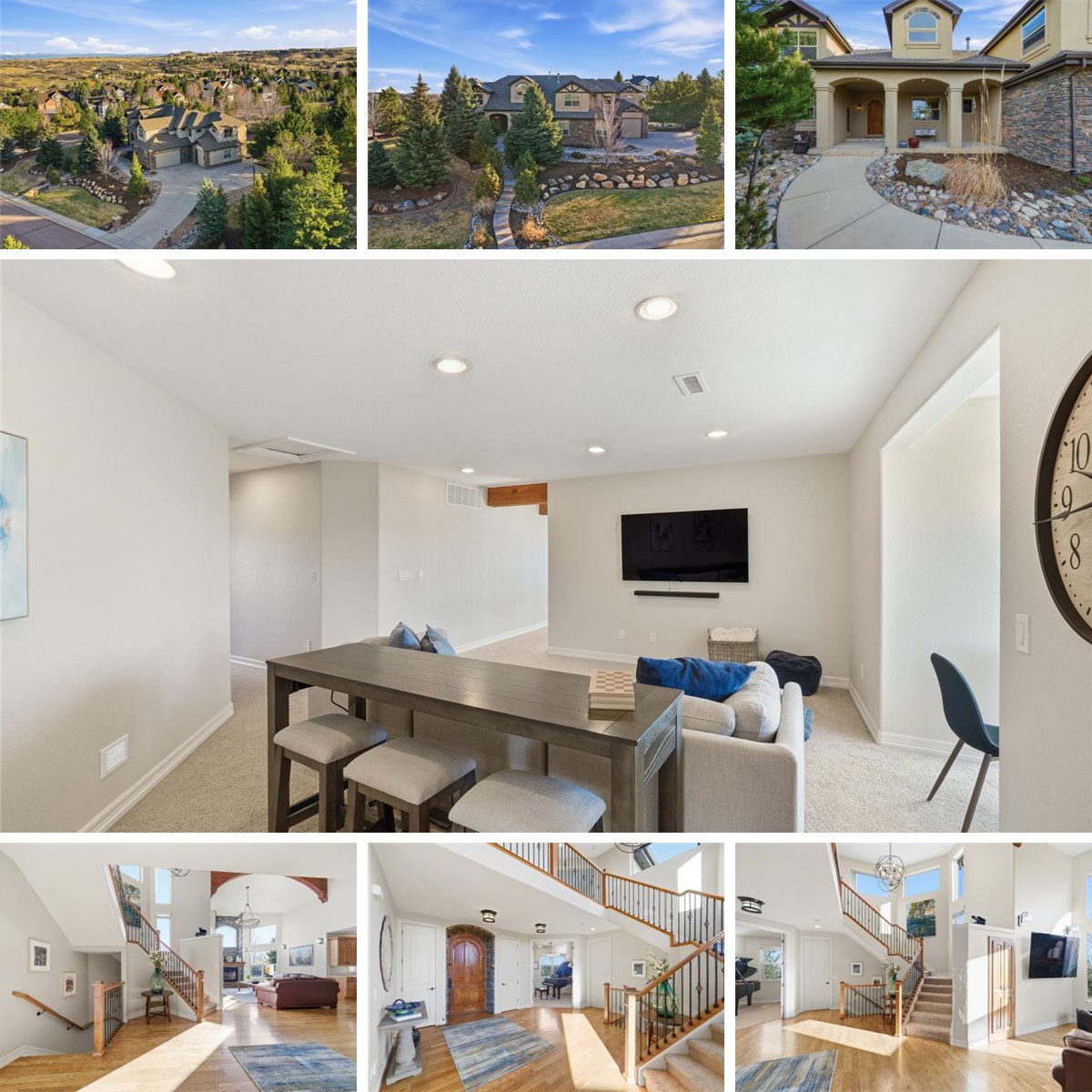 Enjoy Colorado living with sweeping mountain views, mature pines, and a layout engineered for living. This custom 6-bedroom, 6-bath home has an office, 2 staircases, 2 laundry rooms, a finished walkout basement, 3-car garage. Every detail of this home was designed with both elegance and everyday functionality in mind. The soaring two-story great room anchors the main level, with a gas fireplace, natural light, and beautiful wood beams. The gourmet kitchen flows nicely into a spacious dining room, eating area, with direct access to the expansive back deck. A butler's pantry doubles as a main-floor laundry room. A flexible bedroom or office, a ¾ bath, a dedicated second office, mudroom, powder bath, and back staircase round out a floor plan. Upstairs the primary suite is a true retreat: gas fireplace, spa-like 5-piece bath, and a custom walk-in closet. Two bedrooms share a Jack-and-Jill bath, a fourth bedroom enjoys its own ensuite, and a cozy family room creates a natural gathering space. A second laundry room on this level means no hauling baskets up the stairs. The walkout basement is designed for entertaining and built to impress: a sprawling rec room with gas fireplace, a full bar, a dedicated theatre room, a gym or flex office, a bedroom, an ensuite bath, and a large concrete storage room. Walk right out to the backyard, where a hot tub, lush landscaping, and towering pines create a private outdoor sanctuary. One acre of park-like grounds, a south-facing exposure that melts snow fast, and a backyard that feels like a Colorado retreat. The divided 3-car garage features custom cabinetry and serious storage, while the expanded driveway has a full basketball court. This is Castle Pines luxury living at its finest! A rare opportunity to own 287 Claymoor Court in Hidden Pointe Estates with the space, the views, and the lifestyle that defines Colorado at its best.