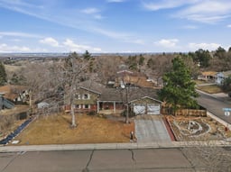 Beautiful tri-level home with a finished basement, ideally situated on a desirable corner lot just two blocks from the hiking and biking trails of Green Mountain. Fresh exterior paint and a welcoming covered front porch create inviting curb appeal. The main level features hardwood flooring throughout the entry, kitchen, and dining nook, with an open-concept living room and kitchen designed for comfortable everyday living and effortless entertaining. Skylights fill the space with natural light, highlighting the granite countertops, center island, ample cabinetry, and included appliances. A sliding glass door leads to the fully fenced backyard, complete with a large patio, covered patio area, and storage shed—perfect for outdoor gatherings and year-round enjoyment. The lower level offers hardwood flooring, a spacious family room with a gas fireplace and custom built-ins, a versatile bedroom ideal for guests or a home office, and an updated three-quarter bath with tile flooring. Upstairs, hardwood flooring continues throughout. The primary suite offers a private three-quarter bath and a built-in closet organizer, while the two additional bedrooms also include built-in closet organizers for enhanced storage and functionality. An updated full bath with skylight and tile flooring serves the upper level. The laundry area is conveniently located in the finished basement. An attached two-car garage provides everyday ease and practicality. Thoughtfully maintained and move-in ready, this home combines functional living spaces with an exceptional location close to outdoor recreation.