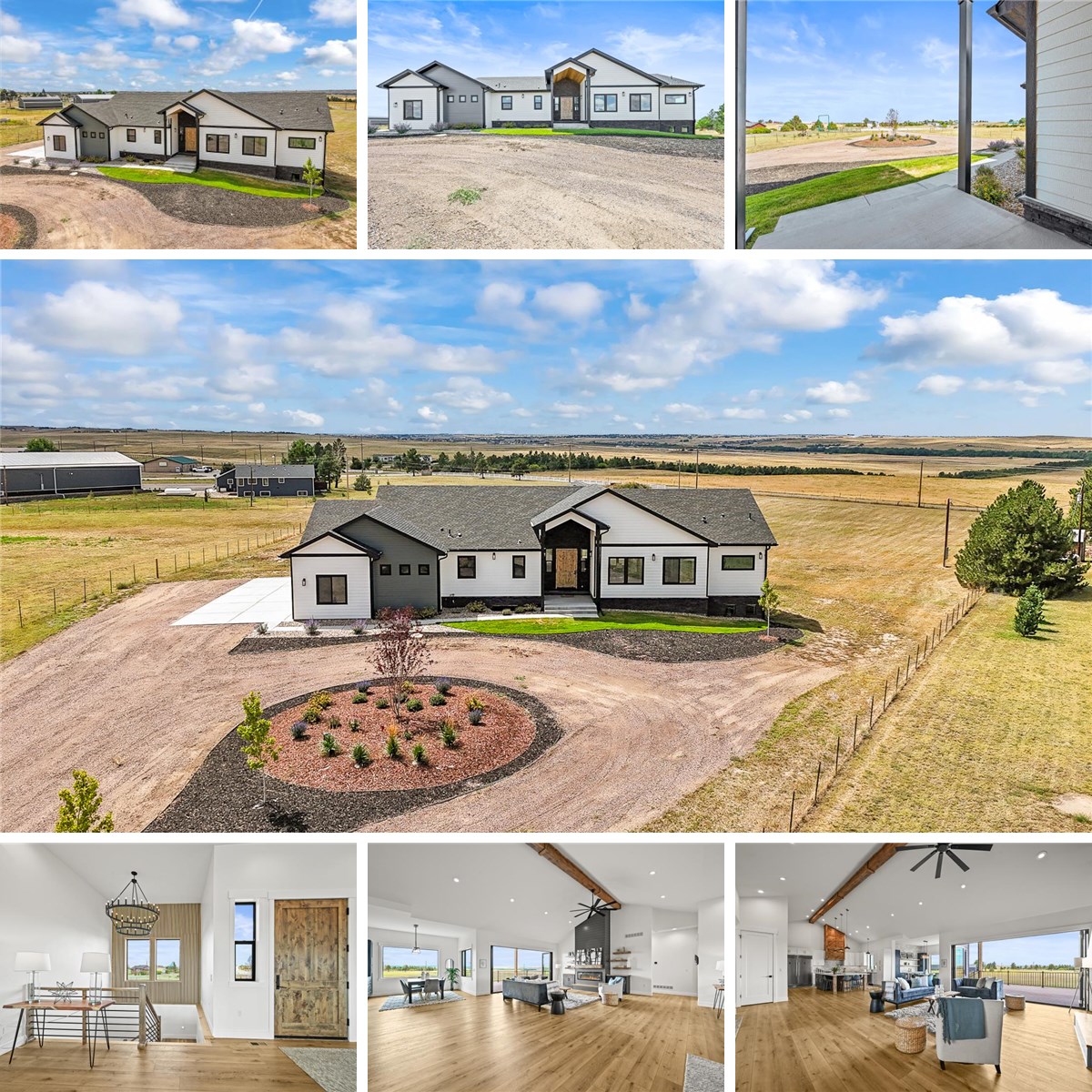 New luxury ranch on 4+ acres with a finished walkout basement and fabulous mountain views! Welcome to this stunning 5-bed, 5-bath custom home, just 1 year old and never lived in, crafted with high-end quality finishes throughout. With over 4,600 sq ft of designer living space plus an oversized 1,300 sq ft garage—perfect for toys, or workshop—this home has it all. Step inside to the impressive great room, where a shiplap fireplace wall with electric fireplace, custom knotty alder shelving and mantle, alder beams, vaulted ceilings, and a dramatic 15-foot bi-fold patio door flood the space with natural light. The gourmet kitchen is a chef’s dream, featuring a massive 6x10 quartzite island, high-end appliances including a 5-foot commercial refrigerator, 4-foot double oven gas range with 6 burners, pot filler, drawer microwave, and workstation sink. Details like a custom alder range hood, white shaker and blue cabinetry with soft-close hardware, brushed gold accents, under-cabinet lighting, and a huge walk-in pantry make this kitchen as functional as it is beautiful. Retreat to the main-level primary suite with spa-like 5-piece bath w/heated floors, rain-head shower fixtures and private patio access. Secondary main-level bedroom or office. The finished walkout basement offers expansive entertainment space with wet bar, plus 3 additional bedrooms and baths—ideal for guests or family. Outside, you’ll find 4 serene acres, an oversized maintenance-free covered deck with views of Pikes Peak and the Rocky Mountain range. Located on a quiet cul-de-sac with ample parking, this home offers the perfect blend of privacy and convenience—just minutes from Parker, Castle Rock, and Southlands shopping and dining. Low HOA—only $80 annually! You won't find nicer finishes anywhere in this price range. This is the Colorado lifestyle you've been looking for!